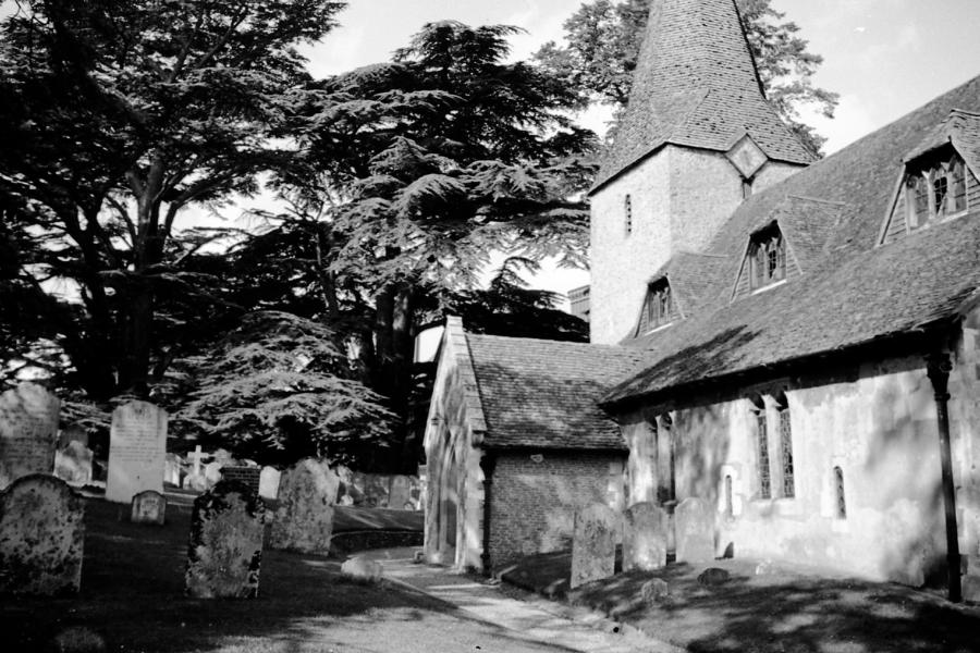 The forest crowds up to the churchyard at All Saints, Minstead and yews and oaks overhang the lychgate.