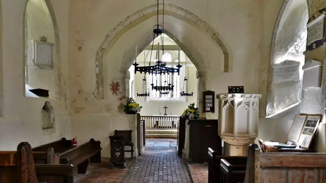 You could miss the church of you weren't looking for it. It’s hidden away down a flinty farm track, with no car park, no gateway to the church yard and just a few ancient tracks between the trees to guide you in.