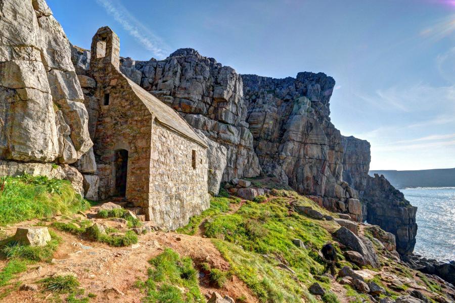 Neu, sut y goroesai yn y fan hyn; fel Capel St Gofan yn Bosherston, hanner ffordd i fyny clogwyn, neu St Cwyfan, Ynys Môn, eglwys ar ynys, ni ellir ei chyrraedd ond pan mae’r llanw’n isel, neu St Tanwyg ger y Bermo, sydd wedi’i suddo yn y twyni tywod, dim ond ugain metr o’r marc dŵr uchel? Pam y cawsant eu hadeiladu yn yr union leoliadau hyn?