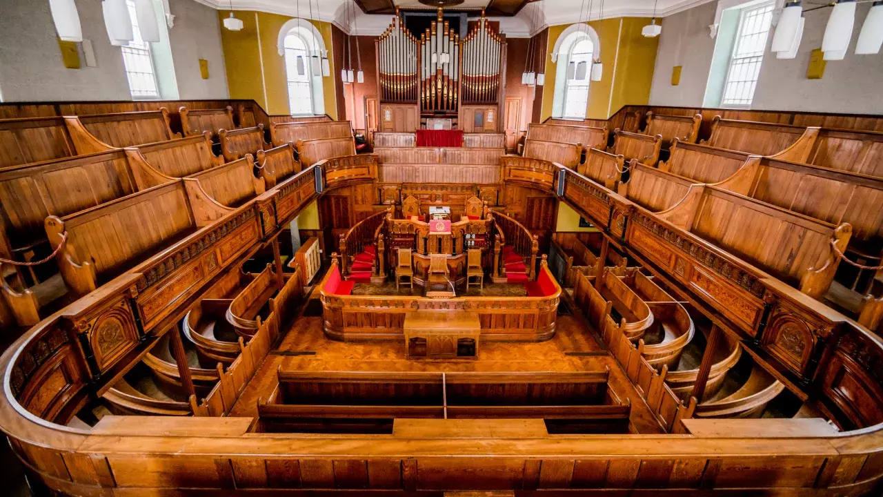 Explore the stunning interior, with its rich woodwork and striking interior, conserved intact for over 100 years. The finely carved mahogany, oak, ebony and pitch pine is testimony to the craftsmanship of local workers, while the ornate panelled ceiling concealing a Victorian ventilation system. And the organ was water powered!